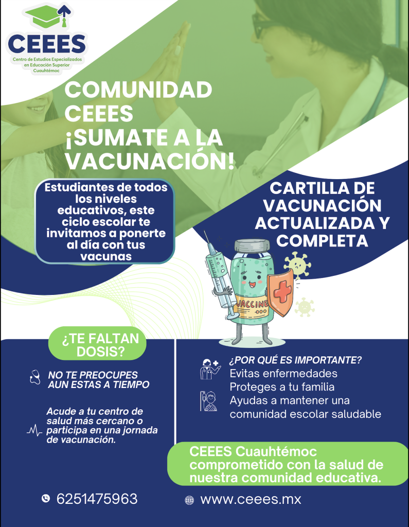 En el Centro de Estudios Especializados en Educación Superior (CEEES) Cuauhtémoc, nos tomamos en serio la salud de nuestra comunidad. Por eso, queremos hacer un llamado especial a nuestras alumnas, alumnos, docentes y familias: verifica que tu cartilla de vacunación esté completa y actualizada, especialmente la vacuna contra el sarampión.
